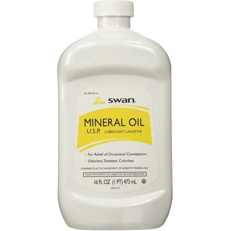Get relief of discomfort and other symptoms caused by irregularity with Swan Mineral Oil. It is odorless tasteless and colorless making it easy to consume. This laxative mineral oil works quickly in most cases within just 5 to 8 hours to produce a bowel movement. It s suitable for adults and children ages 6 years and up who have periodic bouts of constipation or irregularity. It s available in a convenient 16 fl oz bottle.