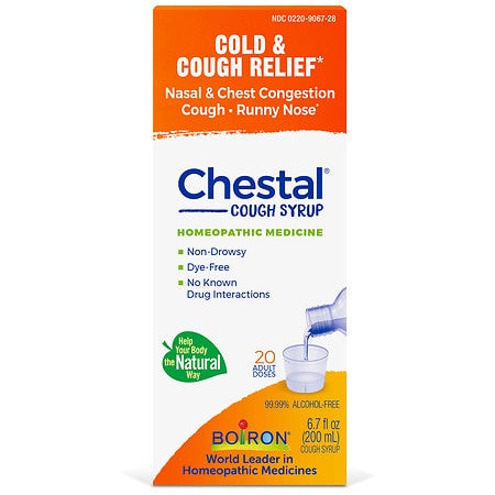 Boiron Chestal Cold & Cough conveniently targets both common cough and cold symptoms with homeopathic medicines. The sweet-tasting multi-symptom syrup relieves nasal and chest congestion dry fitful cough sneezing minor sore throat and runny or stuffy nose.* (BoironUSA.com) *Claims based on traditional homeopathic practice not accepted medical evidence. Not FDA evaluated.