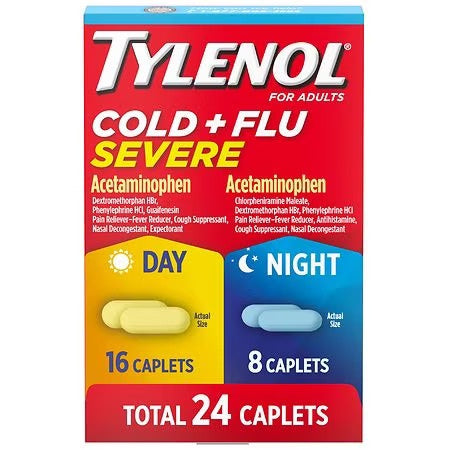 Tylenol Cold + Flu Severe Day/Night Caplets provide temporary relief of cold and flu symptoms. The daytime caplets are formulated to loosen phlegm and temporarily relieve symptoms such as headache, sore throat, nasal congestion and cough. The Nighttime caplets help relieve runny nose and sneezing along with other symptoms such as headache, cough, sore throat, nasal congestion, sinus congestion and pressure. Both formulas also temporarily reduce fever, for relief any time of the day. This convenient combo pack contains 24 caplets with 16 Daytime caplets and 8 Nighttime caplets. Each medicine caplet contains 325 mg of acetaminophen, a pain reliever and fever reducer; 5 mg of phenylephrine HCl, a nasal decongestant; and 10 mg of dextromethorphan HBr, a cough suppressant. The Daytime caplets also contain guaifenesin 200 mg, an expectorant to help loosen phlegm (mucus), while the Nighttime caplets contain chlorpheniramine maleate 2 mg, an antihistamine. Age Group: adult.