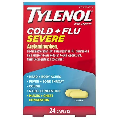 Experience temporary relief from fever, sore throat, headache, nasal congestion, cough, and other cold and flu symptoms with Tylenol Cold + Flu Severe Caplets. This powerful pain reliever and fever reducer medicine tackles cold and flu symptoms by clearing congestion, quieting coughs, and relieving head and body aches. They also temporarily reduce fever and help loosen phlegm (mucus) and thin bronchial secretions to make coughs more productive. Each caplet contains 325 milligrams of the pain reliever and fever reducer acetaminophen and 10 milligrams of the cough suppressant dextromethorphan HBr. Each pill also contains 200 milligrams of the expectorant guaifenesin and 5 milligrams of the nasal decongestant phenylephrine HCl. From the #1 doctor-rmended pain relief brand, this severe cold and flu medicine is suitable for adults and children 12 years and older for effective multi-symptom relief.
