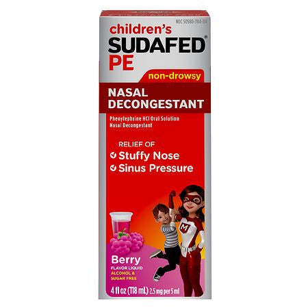 Children s Sudafed PE Nasal Decongestant provides temporary non-drowsy cold relief for symptoms of the common cold hay fever or other upper respiratory allergies. Each 1-tsp serving contains 2.5 mg of the nasal decongestant phenylephrine HCl. Formulated for children ages 4 to 11 this liquid cold medicine for nasal congestion is alcohol-free and sugar-free. Children s Sudafed PE Nasal Decongestant has a berry flavor.