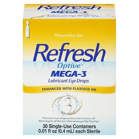 DRY, IRRITATED EYES? REACH FOR MEGA RELIEF. REFRESH OPTIVE MEGA-3 Preservative-Free Lubricant Eye Drops provides prolonged relief and comfort for moderate symptoms of eye dryness. This one-of-a-kind, moisture-rich formula supports all three tear film layers and helps prevent tears from evaporating. It also features HydroCell technology?a proprietary solution that delivers soothing hydration to the eye's surface cells. REFRESH OPTIVE MEGA-3 is great for sensitive eyes and contains 30 single-use, on-the-go vials. Trust your eyes to REFRESH?The #1 selling brand in preservative-free artificial tears.* (*REFRESH Family of Products, Ipsos Healthcare, 2021 REFRESH ECP Rmendation Survey.) Age Group: adult.