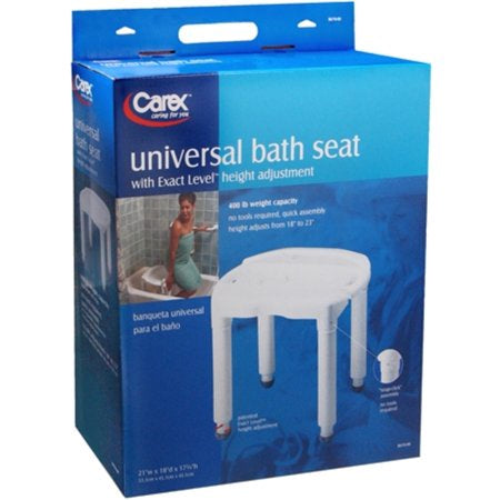 Carex Universal Bath Seat is used for added safety during bathing or showering. Constructed from durable plastic materials the wide 21 W x 18 D seat provides a comfortable level of seating for movement. The universal design of the chair fits into virtually every tub or shower. The Universal Bath Seat with Back fits into virtually every tub or shower whether at home or away. It features an innovative design to support up to 400 lbs. comfortably. The patented Exact Level height adjustment makes height adjustment easy. There are drainage holes in the shower chair to eliminate water pooling and a convenient notch for a hand-held shower spray. This bath chair is easy to assemble without the need for tools. Created for comfort. The shower chair s innovative design provides an uplevel of comfort and shower safety. The wide 18 set provides a comfortable level of seating for movement. Height adjustable 16 to 21 . Our patented Exact Level height adjustment makes adjusting the height easy and quick. No more strug