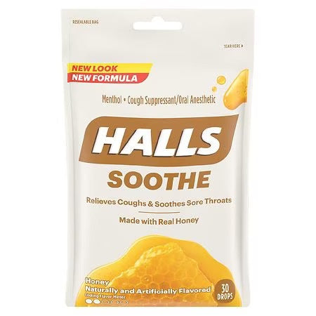 HALLS Soothe Honey Cough Drops are ready for whatever life throws or coughs your way. With 1.8 mg of menthol per drop these throat lozenges relieve coughs and soothe sore throats to relieve your worst symptoms. This effective cough suppressant comes in a soothing honey flavor made with real honey. Whether you re using HALLS cough drops for sore throat relief cough relief or as an oral anesthetic simply dissolve one drop in your mouth slowly and repeat every two hours as needed. HALLS Soothe cough drops are formulated for adults and children five years and older. Each bag holds 30 individually wrapped drops and is resealable making it ideal for stowing in your travel pack purse or desk drawer. This pack is also a perfect inclusion in a healthy gift or care package.
