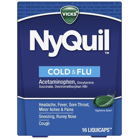 Cold & Flu, Nighttime Relief, LiquiCapsOther Information: Store at room temperature. Misc: Acetaminophen, doxylamine succinate, dextromethorphan HBr. Aches, fever & sore throat. Sneezing, runny nose. Cough. www. vicks.com. Parents: Learn about teen medicine abuse. www. StopMedicineAbuse.org. Made in Canada.
