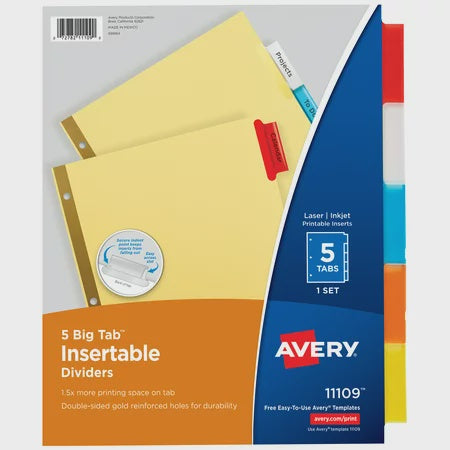 Avery Big Tab dividers are bigger providing 50% more writing space than standard tabs. Special tab design allows easy insertion and removal but keeps insert securely in place. Reinforced binding edge. Buff color paper dividers with multicolor insertable tabs are great for organization and easy to customize with free templates at avery.com/templates.
