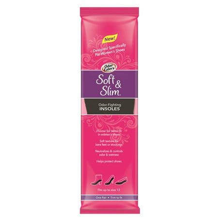 Odor Eaters Soft & Slim insole is specifically designed for Women s shoes. These odor-fighting insoles are thinner for better fit and designed to have a soft texture for bare feet or stockings. Soft & Slim insoles neutralizes and controls odor and wetness while helping protect shoes. These thin soft-touch insoles fit discreetly into any shoe style and are comfortable to wear with or without socks. Fits up to size 12. Each package contains 1 pair (2 insoles) that are able to be trimmed to fit your shoe size and shape.