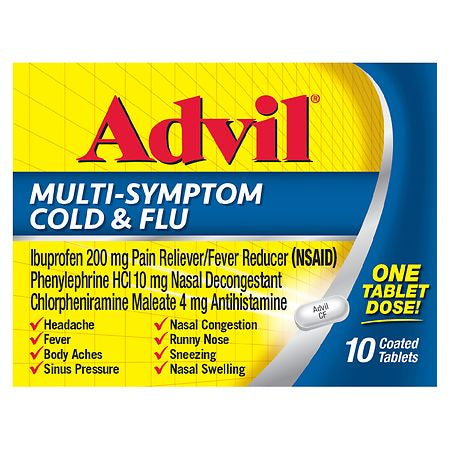 Don?t let a cold or flu slow you down fight back with Advil Multi-Symptom Cold & Flu. One powerful pill relieves your toughest cold and flu symptoms so you can power through your day. The #1 selling ibuprofen brand now comes with eight-symptom relief for nasal congestion nasal swelling runny nose sneezing sinus pressure headache fever and body aches. When you need flu or cold symptom medicine that works choose Advil Multi Symptom Cold & Flu with the unique triple ingredient combination of pain reliever (Ibuprofen) nasal decongestant (Phenylephrine HCI) and antihistamine (Chlorpheniramine Maleate) to tackle your worst cold and flu symptoms. Experience the power of Advil now for cold and flu.