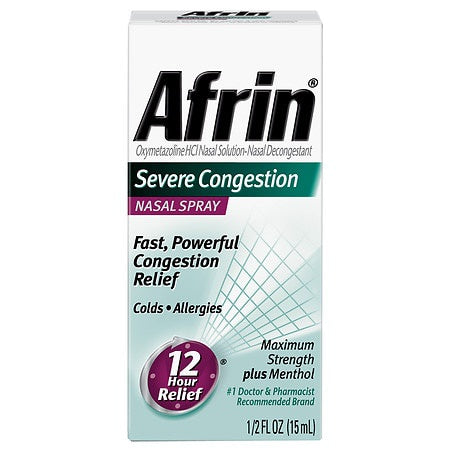 Afrin Severe Congestion Maximum Strength 12 Hour Nasal Decongestant Spray provides fast powerful medicated relief of severe sinus congestion and nasal congestion from colds or allergies. Formulated with menthol this maximum strength nasal decongestant starts to work instantly. Just two quick firm sprays in each nostril deliver measured doses of the medicine that provides severe nasal and sinus congestion relief. This medicated 12 hour nasal spray works well for adults and children 6 to 12 years with adult supervision helping those with severe nasal congestion breathe through the nose more freely all day.