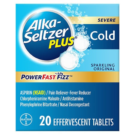 In 1968 we harnessed the fast-dissolving power of Alka-Seltzer Plus Cold Sparkling Original Effervescent Tablets in a cold symptom relief medicine. Today we improved our formula by having less sodium less residue and making it aspartame free. Each dose is individually wrapped and transforms in just 4 oz. of water into a liquid-fast medicine. Alka-Seltzer Plus works quickly to relieve your worst cold symptoms: nasal congestion runny nose sore throat headache and body ache sinus pressure.