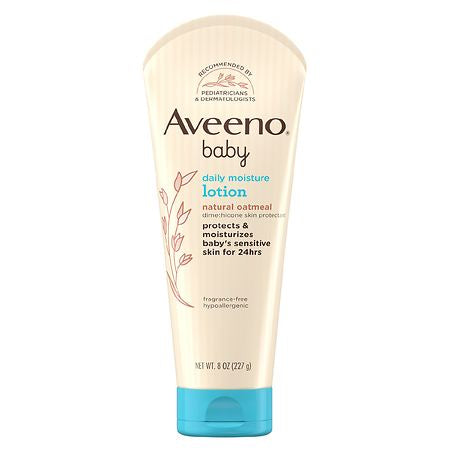Aveeno Baby Daily Moisture Body Lotion with natural colloidal oatmeal features a nourishing non-greasy formula that helps protect your little one s delicate skin and moisturizes for a full 24 hours. This nourishing baby moisturizing lotion is specially formulated to be gentle enough for babies. Natural colloidal oatmeal blended with dimethicone skin protectant allows this oatmeal baby body lotion to moisturize for a full 24 hours and helps prevent and temporarily protect chafed chapped or cracked skin. From a pediatrician-recommended brand this hypoallergenic baby lotion can be used every day to keep your baby s skin soft smooth and healthy looking. From Aveeno a pediatrician and dermatologist-recommended brand the non-greasy lotion formula is free from fragrance parabens steroids phenoxyethanol and phthalates so it won t irritate baby s sensitive skin.