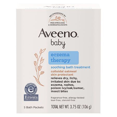Aveeno Baby Eczema Therapy Soothing Bath Treatment helps relieve minor skin irritation and itching caused by rashes eczema poison ivy poison oak poison sumac or insect bites. From the dermatologist and pediatrician-recommended brand this baby bath treatment is indicated to relieve dry itchy irritated skin and is accepted by the National Eczema Association. The unique formula of this tear-free and allergy-tested baby eczema therapy bath combines natural colloidal oatmeal skin protectant with a special moisturizer to help provide baby with dry skin relief. When dispersed in water the ultra-fine powder forms a milky soothing bath that also works as a natural soap-free cleanser and is gentle enough for delicate skin. After bathing your baby s skin becomes softer and smoother and dry irritated skin is relieved. Aveeno Baby Eczema Therapy Soothing Bath Treatment is gentle on eyes and free of steroids soap parabens phthalates phenoxyethanol and fragrances.