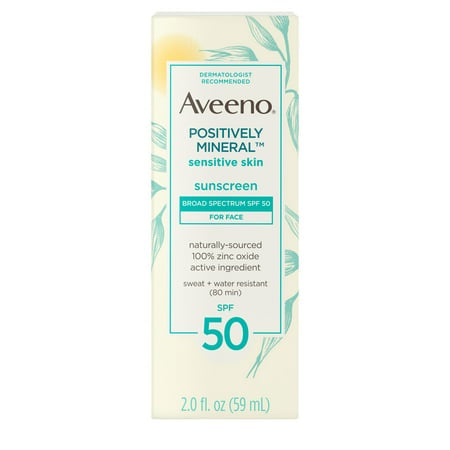 Help protect your face from the sun s damaging UVA/UVB rays with Aveeno Positively Mineral Sensitive Skin Face Sunscreen Lotion with Broad Spectrum SPF 50. Specially designed for sensitive facial skin this hypoallergenic mineral sunscreen is gentle on the eye area and fragrance- paraben- phthalate- and dye-free. The lightweight non-comedogenic facial sunscreen dries sheer with a matte finish so it layers invisibly under makeup. Containing naturally-sourced 100% zinc oxide active ingredient vitamin E feverfew and nourishing oat the oil-free fast-absorbing formula is both sweat- and water-resistant for up to 80 minutes so you spend less time reapplying. The TSA-friendly travel size means you can easily take the daily sunscreen lotion wherever you go. For best results apply Aveeno Positively Mineral Sensitive Skin SPF 50 Sunscreen 15 minutes before sun exposure and reapply at least every two hours.