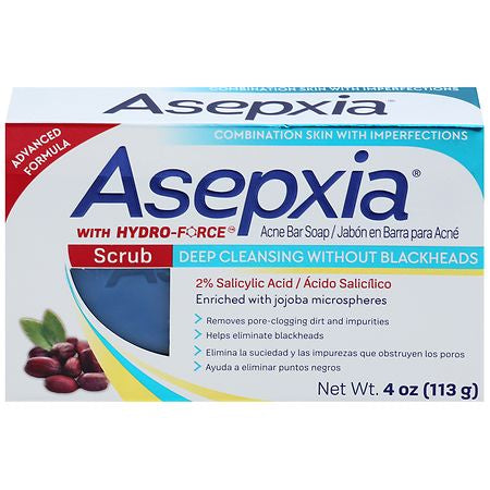 Asepxia Scrub Acne Bar Soap is specially formulated for deep cleansing and gentle skin care. With maximum strength Salicylic Acid for acne treatment and prevention. Hypoallergenic. For oily skin control. Deeply cleans and exfoliates without over-drying. Helps allow skin to heal. Apply liberally over wet skin with a clean washcloth or body puff concentrating on areas prone to acne. Rinse thoroughly and pat dry with a clean towel. If bothersome dryness or peeling occurs reduce application to every other day. This bar soap is enriched with jojoba microspheres and reduces the number of acne pimples!