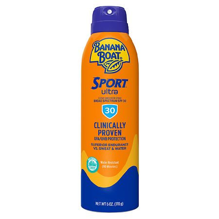 Great for your active lifestyle! Banana Boat Sport Ultra Clear Spray Sunscreen provides strong reef friendly protection that absorbs quickly is non-greasy and won t run into your eyes. These lightweight clear sprays are designed especially for sport enthusiasts and other active individuals who need sport-strength sun protection that doesn?t play around! Banana Boat Sport Ultra Clear Spray Sunscreen has superior endurance versus sweat and water and will last as long as the fun does*! *Reapply this safe and effective broad spectrum UVA and UVB protection as directed on the product label. Protect the fun on earth with Banana Boat! Banana Boat Sport Ultra Sunscreen Spray 6 Oz 30 SPF Water Resistant Sunblock (80 Minutes) Superior Endurance VS Sweat And Water: