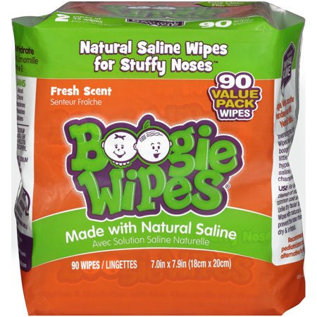 Boogie Wipes Natural Saline Kids and Baby Nose Wipes for Cold and Flu Recommended by parents and pediatricians alike Boogie Wipes are a gentle easy alternative to dry tissues and saline drops and can soothe even the most tender noses. Since their patented formula contains natural saline these wipes are great for all ages from congested infants and newborns to stuffy toddlers. Saline is naturally occurring in the body and pediatricians regularly recommend its use for breaking up and clearing out snot. Boogie Wipes also soothe and moisturize skin and noses with Aloe Chamomile and Vitamin E. Simple and fun these kid friendly wipes encourage kids to blow their own nose. Boogie Wipes products are safe for all kids and were created by moms for moms.