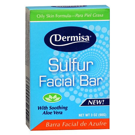 Dermisa Sulfur Bar. Effective in cleansing oily skin that can clog pores in acne-prone skin so it helps reduce spots pimples and blackheads. Although intended primarily to combat oily skin this 100% vegetable base soap bar also contains Aloe Vera to alleviate dryness and help soothe skin. Sulfur is natural and its properties help reduce and clarify blemishes by drying the surface of the skin absorbing oil (sebum) which can contribute to acne breakouts. Sulfur also promotes the shedding of dead skin which can cause clogged pores.