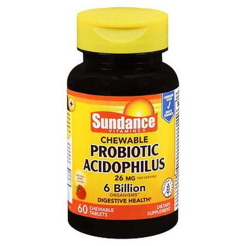 Helps support digestive health.* Helps maintain healthy intestinal flora balance.* Delicious chewable tablets. Natural berry flavor. Gluten free. You deserve to be happy and healthy. Sundance Vitamins makes superior quality nutritional products affordable for everyone. We believe each person deserves to live their healthy lifestyle without worrying about cost, one product at a time. *These statements have not been evaluated by the Food and Drug Administration. This product is not intended to diagnose, treat, cure or prevent any disease.Ingredients: 2 Chewable Tablets: Probiotic Blend 26 mg (Contains 6 Billion Active Organisms)** (Lactobacillus Paracasei, Lactobacillus Plantarum, Lactobacillus Acidophilus, Lactobacillus Rhamnosus, Lactobacillus Bulgaricus, Lactobacillus Salivarius, Lactobacillus Casei, Bifidobacterium Bifidum, Lactobacillus Brevis, Bifidobacterium Lactis); Fructose; Sorbitol; Mannitol; Cellulose (Plant Origin); Xylitol; Maltodextrin; Citric Acid; Vegetable Magnesium Stearate; Ascorbic Acid; C