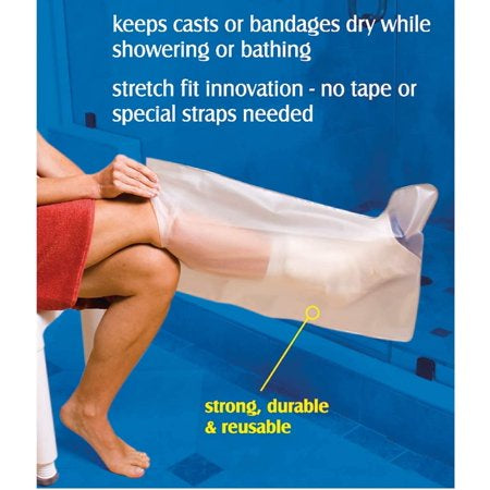 The EZ Stretch Leg Cast Protector was designed to easily stretch over the cast and then self-seal tightly around arm without tape or straps. This cast protector is made from durable reusable and latex free material. Will not rip or puncture easily and can be put one with one hand. Fits most adults and children.