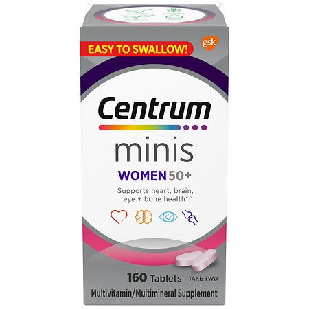 Centrum Minis Women 50+ Multivitamin Supplement is a daily supplement personalized for women aged 50+. Featuring tablets that are 50% smaller than regular Centrum Silver Women Centrum Minis Women also have a smooth coating that makes the tablets easy to swallow. Made up of key vitamins and minerals these daily supplements support the whole body: B vitamins help promote heart health3; Zinc and B vitamins help support normal brain function; and vitamins A C E and Lutein+ help support healthy eyes; a combination of vitamin D and calcium to help maintain strong bones*. Non-GMO~ and gluten free Centrum Minis Women 50+ Multivitamin Supplement contains no artificial sweeteners or artificial flavors. Centrum Minis Women 50+ Multivitamin Supplement includes 160 tablets for 80 days. Daily multivitamins help maintain a healthy lifestyle ? help support your whole body health with Centrum*. Providing multivitamin and multimineral supplements for men women and children around the world for years Centrum is the #