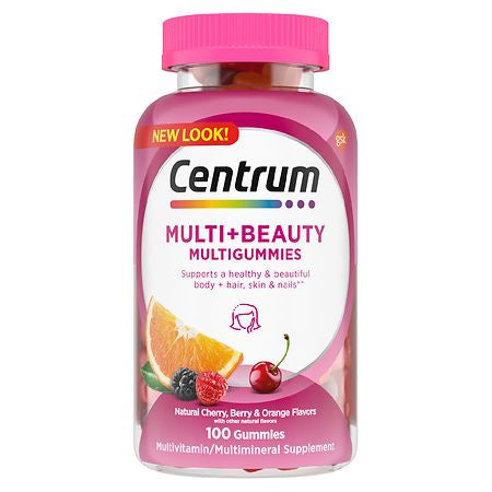 Centrum Multi + Beauty Gummy Multivitamin For Women is a daily multivitamin/multimineral supplement formulated with hair skin and nails vitamins to support a healthy, beautiful body. These beauty multivitamin gummies deliver a blend of 12 key nutrients, including biotin and vitamins A, C and E to help maintain a healthy appearance, and vitamin D and calcium to help maintain strong bones. These women's gummy multivitamins also provide B vitamins to support your daily energy needs, and antioxidants to support normal immune function. Made with gluten free ingredients and no artificial flavors or sweeteners, these multivitamin gummies for women come in great-tasting cherry, berry, and orange flavors. Feed your cells, fuel your life with Centrum, the #1 doctor and pharmacist rmended brand. Age Group: adult.