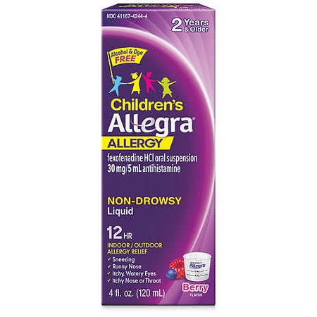 Kid allergies are unpleasant. Taking their allergy medicine doesn't have to be. Alleviate their worst allergy symptoms with Allegra Children's Non-Drowsy Antihistamine Liquid Berry Flavor. Children's Allegra for kids 2 years and older provides 12 full hours of non-drowsy relief from sneezing, runny nose, itchy and watery eyes, and itchy nose or throat. Use Allegra Children's Liquid for indoor and outdoor allergies, including seasonal allergies and pet allergies. Best of all, this berry-flavored allergy medicine is made with active ingredient fexofenadine, a non-drowsy antihistamine. Be ready for spring allergies, fall allergies, dog allergies and more. Stock up on Children's Allegra 12-Hour Berry Flavor Liquid Allergy Medicine. DIRECTIONS: Adults and children 12 years of age and over: Take 10 mL every 12 hours; do not take more than 20 mL in 24 hours. Children 2 to under 12 years of age: Take 5 mL every 12 hours; do not take more than 10 mL in 24 hours. Children under 2 years of age: Ask a doctor. Adults 65