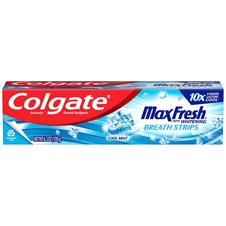 Colgate Max Fresh with Whitening Toothpaste 6.3 Oz Tube Colgate Max Fresh with Whitening Toothpaste has 10X longer lasting cool* so you can breathe confidently. This breath freshening toothpaste has a unique toothpaste formula that is packed with hundreds of mini breath strips and unleashes a powerful rush of freshness for long-lasting fresh breath. Colgate Max Fresh with Whitening Toothpaste with Breath Strips has a Cool Mint flavor and invigorates your brushing experience. This fluoride toothpaste leaves your breath feeling fresh for hours. Plus this teeth whitening toothpaste fights cavities and whitens teeth leaving you with a confident smile. A Fresh Experience in Fighting Bad Breath Get long-lasting fresh breath with Colgate Max Fresh. It?s not just toothpaste for bad breath Colgate Max Fresh with Whitening Toothpaste is also a fluoride toothpaste so it whitens teeth and helps prevent cavities. Breathe easier with the confidence to get closer. Pair Colgate Max Fresh toothpaste with toothbrushes