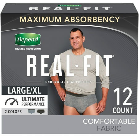 Comfort style and trusted protection makes Depend Real Fit Incontinence Underwear for men a great fit for you and your lifestyle. Choose disposable underwear you can trust by using our maximum-absorbency incontinence underwear that absorbs up to 10x its own weight to protect against bladder incontinence. And say goodbye to uncomfortable adult diapers by saying hello to breathable premium cotton-like materials in our incontinence briefs. Our disposable underwear even features a stretch waistband for a secure fit and comfortable tailored leg elastics to help prevent leaks. Plus our CleanFresh layer locks away odor and wetness instantly to keep you fresh and dry all-day long. Find your perfect look with two sizes?small/medium (28?40 waist) and large/extra-large (38?50 waist)?and stylish colors like black and gray. Some more good news: This product is FSA-eligible in the U.S.
