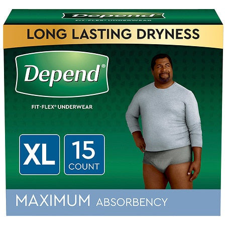 Depend Fit-Flex Men s Incontinence Underwear keeps you protected from bladder leaks with DryShield Technology providing you all day comfort guaranteed.* Absorbent material instantly locks in wetness and odors providing long lasting dryness and a more comfortable** experience. Designed with the SureFit waistband to help keep it in place and form-fitting elastic strands to provide a discreet fit under clothing unlike bulky adult diapers. This disposable underwear is available in a masculine grey color. Unscented underwear is soft quiet and breathable. Depend FIT-FLEX for Men with Maximum Absorbency is available in four sizes: size small/medium (26-34? waist) size large (35-43? waist) size extra-large (44-54? waist) size extra-extra large (55-64 waist). Skip the store and order your Depend adult incontinence supplies to be shipped to your doorstep in a discreet box. HSA/FSA-eligible in the U.S. *If you re not completely satisfied with the fit of your Depend Underwear we can help. Original receip