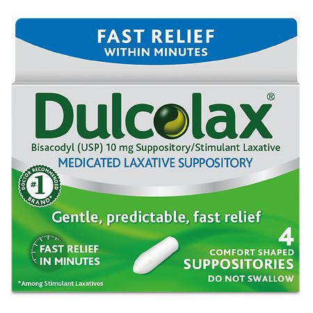 Constipated Time s up. Dulcolax Medicated Laxative Suppositories can help get you going in 15-60 minutes. These comfort-shaped suppositories are medicated with the active ingredient bisacodyl for fast relief in minutes. As with any suppository Dulcolax medicated suppositories are for rectal use only; do not swallow. Looking for relief in 6-12 hours Try Dulcolax Stimulant Laxative Tablets for gentle relief. Trust the No. 1 doctor-recommended stimulant laxative brand for relief when you need it most. DIRECTIONS: Adults and children 12 years of age and over: 1 suppository in a single daily dose. Peel open plastic. Insert suppository well into the rectum pointed end first. Retain about 15 to 20 minutes; Children 6 to under 12 years of age: 1/2 suppository in a single daily dose; Children under 6 years of age: ask a doctor. Among OTC Stimulant Laxatives.