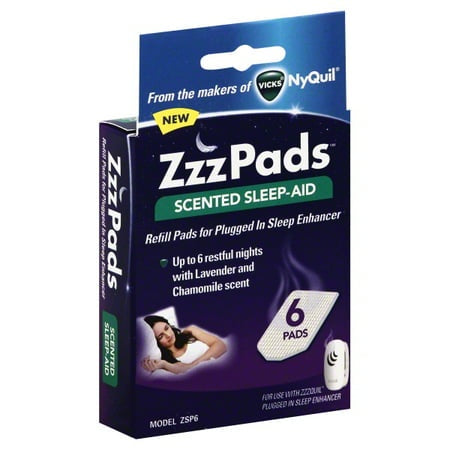Sleep-Aid Scented ZzzPads Box 6 CT Model ZSP6. Refill pads for plugged in sleep enhancer. From the makers of Vicks NyQuil. New. UP to 6 restful nights with lavender and chamomile scent. For use with ZzzQuil plugged in sleep enhancer. Questions? Call toll-free: 1-800-VAPOR-1-2 (1-800-827-6712). Visit our website: www.kaz.com/zzzquil. Store between 32-120 degrees F (0-49 degrees C). A. Recommended ge: Note: Tear pouch at notch to expose pad. Not recommended for infants under 10 pounds. Eye irritant. Read cautions on back panel carefully. Contact with exposed pad may cause eye irritation. In case of contact with eyes flush with water immediately. If eye irritation persists consult a doctor. Do not place in microwave. Do not touch exposed pad with skin. In case of contact with skin wash area immediately with plenty of water. Do not place exposed pad on furniture fabrics bedding and plastics. Do not add any liquids to the pad or use more than one pad per slot at a time. For scent only pad is not to be in