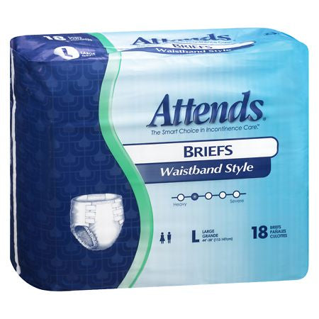 We offer a full line of briefs to suit all lifestyles and sizing needs-for women, men and youth. Attends Briefs are perfect for heavy to severe urinary and/or fecal incontinence for both ambulatory and sedentary users. We carefully select the raw materials and engineer our briefs to channel wetness away from the body helping maintain dry, healthy skin and controlling odor.Regardless of the style you choose, Attends briefs are always designed for comfort and secure protection. All of our briefs contain super absorbent polymers to lock fluid in the core, as well as a moisture-proof layer and leg gathers to prevent leakage. They feature closures to hold them securely in place and a color indicator to signal when the brief needs to be changed. Attends briefs are packaged for easy identification of sizing by color. Attends Briefs Waistband Style offer many of the same features and benefits of our other briefs, but are specifically made to provide a more customized fit with its unique waistband design.