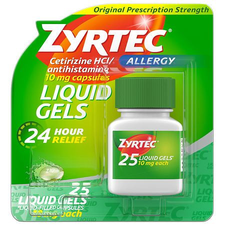 Zyrtec Allergy Relief Liquid Gels provide 24-hour relief of your worst indoor and outdoor allergy symptoms. With 10 milligrams of the antihistamine cetirizine hydrochloride per capsule, this prescription-strength allergy medicine starts working hard at hour 1 and works twice as hard when you take it again the next day. This seasonal allergy medicine provides relief from symptoms caused by hay fever and other upper respiratory allergies, including runny nose, sneezing, itchy, watery eyes, and itching of the nose or throat. From the #1 allergist-rmended brand among OTC oral antihistamines, this cetirizine hydrochloride anti-allergy medicine is effective in treating indoor allergies from dust, mold, and pet dander, and outdoor allergies caused by tree pollen, weeds, and grasses. Zyrtec all-day allergy relief antihistamine capsules with cetirizine HCl are suitable for adults and children six years and older, with one dose providing effective allergy relief for a full 24 hours. Size: 25 Count.