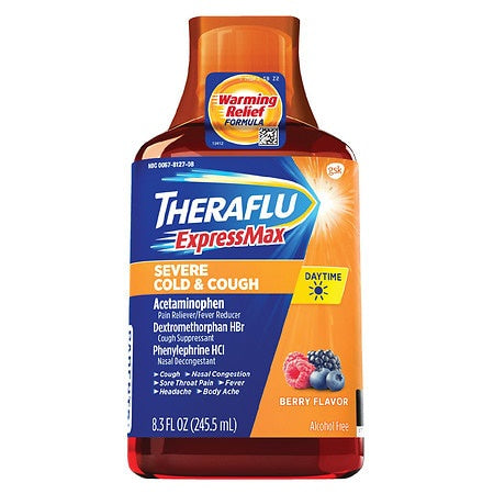 Daytime cold medicine and cough syrup for severe cold & flu symptomsSevere daytime cold, flu, & cough syrup, relieves symptoms such as: sore throat, cough, headache, minor body aches & pains, and nasal congestionTemporarily reduces fever associated with cold & flu symptomsBerry flavored cold & cough syrup and provides warming, soothing relief from cold & flu symptomsTheraflu ExpressMax Severe cold medicine & cough syrup also available in a nighttime formula