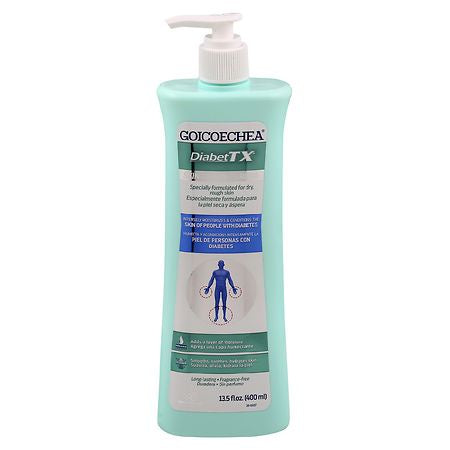 Goicoechea Diabettx Skin Lotion 13.5 oz. Goicoechea Diabet TX Skin lotion intensely moisturizes and conditions the skin of people with diabetes. Adds a layer of moisture. Smooths soothes hydrates skin. Starts working from the first application to enhance the beauty of skin. Specially formulated for dry rough skin. Long-lasting. Fragrance-free. Citrus and red tea extracts for silky skin. Smooths the feel of Orange Peel Skin replenishes skin moisture and improves the appearance of skin on varicose veins areas.