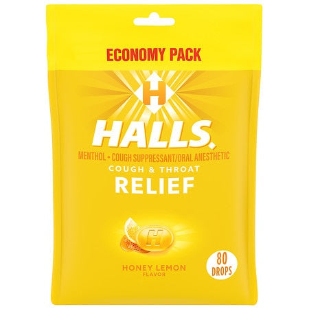 HALLS Relief Honey Lemon Cough Drops are ready for whatever life throws, or coughs, your way. Using the power of menthol, HALLS cough drops relieve coughs, soothe sore throats and cool nasal passages to relieve your worst symptoms. This effective cough suppressant comes in a soothing and refreshing honey lemon flavor. Whether you're using these menthol cough drops for sore throat relief, cough relief or as an oral anesthetic, dissolve one drop in your mouth slowly, and repeat every two hours as needed. HALLS Relief cough drops are formulated for adults and children five years and older.