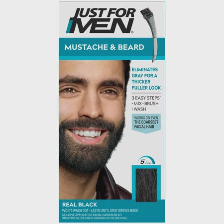 5 Easy minutes. Eliminates grays for a thicker fuller look. More guys trust their facial hair Just For Men? mustache and beard because our beard dye is specially designed for coarse facial hair. In 5 minutes gray is gone. As a bonus facial hair feels softer and more manageable. Made with biotin aloe and coconut oil. Can t decide between two shades? Try the lighter one first. You can always go darker later.