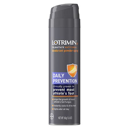 Prevent the uncomfortable itching burning cracking and scaling symptoms of Athlete s Foot with Lotrimin AF Daily Prevention Deodorant Antifungal Powder Spray. It also instantly cools and dries feet and fights odor all day. The active ingredient in this athlete s foot prevention spray is tolnaftate which is clinically proven to prevent most athlete s foot fungus. Prevent and stop the growth of most athlete s foot fungus with the power of Lotrimin AF Daily Prevention Deodorant Foot Powder Spray ? your tinea pedis is no match for this prevention product that works to stop the fungus that causes athlete s foot. Safe for kids over 2. Use as directed.