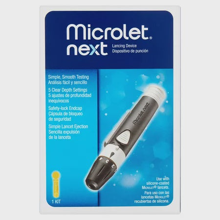 Lancing Device. 1 Kit: 1 MICROLET®NEXT lancing device with adjustable endcap; 5 MICROLET® sterile lancets, coated with silicone; Made by ASCENSIA DIABETES CARE US INC.