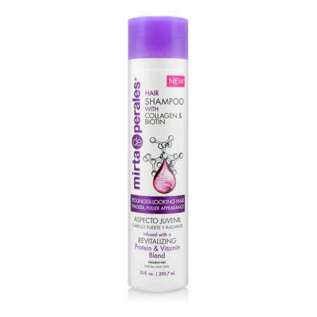 Mirta de Perales Younger Looking Shampoo with Collagen and Biotin Blend provides fuller thicker healthier-looking hair. Sulfate and Paraben free shampoo enriched with Collagen and Biotin. Enhances hydration and elasticity. Adds volume.Strengthens hair from root to ends. Protects against breakage. Safe for color and keratin treated hair.