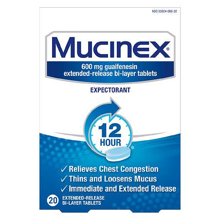 Mucinex Extended-release Bi-layer tablets provide powerful symptom relief. The product relieves chest congestion, thins and loosens mucus and lasts for 12 hours. It contains a unique bi-layer tablet - one layer for immediate release and one layer for extended release, so the medicine starts to release right away and lasts for up to 12 hours, so you can say goodbye to retaking medicine every 4 hours. Mucinex is the #1 Cold and Cough brand doctors trust for themselves and their families* and the #1 Pharmacist Rmended Brand? as well. This product contains 120 tablets. It can be used by Adults and Children 12 years of age and over. KEY SYMPTOMS RELIEVED: Mucinex Extended-release Bi-layer tablets relieve chest congestion and thin and loosen mucus ACTIVE INGREDIENT: Contains Guaifenesin which is an expectorant that relieves chest congestion and thins and loosens mucus making cough more productive Use as directed *IQVIA using ProVoice Survey, August 2020 ?U.S. News and World Report/Pharmacy Times 2020-2029
