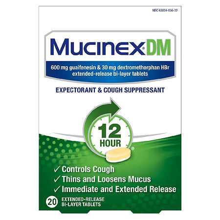 Mucinex DM Extended-release Bi-layer tablets provide powerful symptom relief. The product controls cough relieves chest congestion thins and loosens mucus and lasts for 12 hours. It contains a unique bi-layer tablet - one layer for immediate release and one layer for extended release so the medicine starts to release right away and lasts for up to 12 hours so you can say goodbye to retaking medicine every 4 hours. Mucinex is the #1 Cold and Cough brand doctors trust for themselves and their families* and the #1 Pharmacist Recommended Brand? as well. This product contains 20 tablets. It can be used by Adults and Children 12 years of age and over.KEY SYMPTOMS RELIEVED: Mucinex DM Extended-release Bi-layer tablets control cough relieve chest congestion and thin and loosen mucusACTIVE INGREDIENTS: Contains Guaifenesin which is an expectorant that relieves chest congestion and thins & loosens mucus making cough more productive and Dextromethorphan HBr which acts as a cough suppressantUse as directed*IQVIA