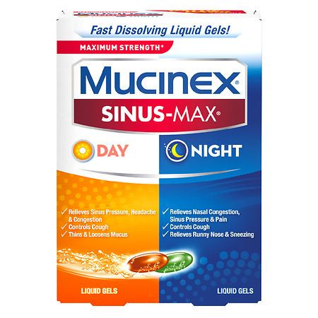 Maximum Strength Mucinex Sinus-Max Day and Night is an OTC medicine for relief of your Multi-symptom Sinus Relief. Maximum Strength Mucinex Sinus- Max Day helps relieve pain, sinus pressure, headache, cough, congestion, thins and loosens mucus and chest congestion. Maximum Strength Mucinex Sinus- Max Night helps relieve pain, sinus pressure, nasal congestion, cough, and runny nose and sneezing. Mucinex is the #1 Cold and Cough brand doctors trust for themselves and their families*. This product contains 24 Fast Dissolving Liquid Gels (16 Day + 8 Night). It can be used by Adults and Children 12 years of age and over. SINUS SYMPTOMS RELIEVED DAY SYMPTOMS RELIEVED: Maximum Strength Mucinex Sinus-Max Day helps relieve pain, sinus pressure, headache, cough, congestion, thins and loosens mucus and chest congestion NIGHT SYMPTOMS RELIEVED: Maximum Strength Mucinex Sinus-Max Night helps relieve pain, sinus pressure, nasal congestion, cough, and runny nose and sneezing KEY INGREDIENTS MUCINEX SINUS-MAX DAY ACTIVE ING