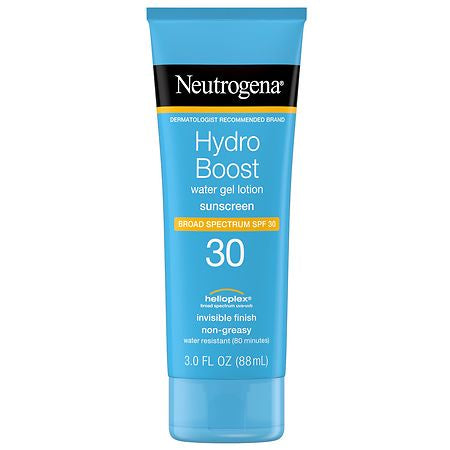 Add SPF to your new skincare routine. Neutrogena Hydro Boost Water Gel Moisturizing Sunscreen Lotion with Broad Spectrum SPF 30 delivers superior broad spectrum UVA/UVB protection and hydration with a water-light refreshing feel. This water-resistant sunscreen lotion for face & body leaves skin looking healthy and moisturized for up to eight hours without any greasy residue or white marks. The non-greasy SPF 30 sunscreen has a light clean feel and layers invisibly under makeup. Neutrogena Hydro Boost Water Gel Lotion Sunscreen with Broad Spectrum SPF 30 is oil-free and non-comedogenic which means it won t clog pores. From the #1 dermatologist recommended suncare brand this oxybenzone-free sunscreen lotion with hyaluronic acid helps prevent sunburn when used as directed with other sun protection measures.