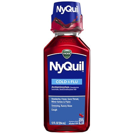 From the world's #1 selling OTC cough and cold brand, Vicks NyQuil Cold and Flu Liquid provides fast, powerful relief for your worst cold and flu symptoms. Get the NyQuil you trust in a great-tasting Cherry flavor. When cold symptoms keep you up, turn to Vicks NyQuil Cold and Flu nighttime relief over-the-counter medicine to help you get the rest you need. When you need fast relief, this powerful, multi-symptom relief medicine treats headache, fever, sore throat, minor aches and pains, sneezing, runny nose, and cough due to minor throat and bronchial irritation. Nothing works faster. Vicks has been trusted for over 125 years to relieve your cold and flu symptoms. Vicks NyQuil is the #1 pharmacist rmended nighttime cough, cold and flu brand*Active ingredients per 30 mL dose for adults are acetaminophen 650 mg (pain reliever/fever reducer), dextromethorphan HBr 30 mg (cough suppressant), and doxylamine succinate 12.5 mg (antihistamine). Store at room temperature; do not refrigerate. Take only as directed. Use
