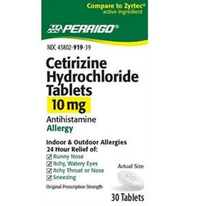 Perrigo Cetirizine Hydrochloride Tablets 10mg 30ct Suggested Use: N/A Active Ingredients: N/A Inactive Ingredients: N/A Other Ingredients: N/A