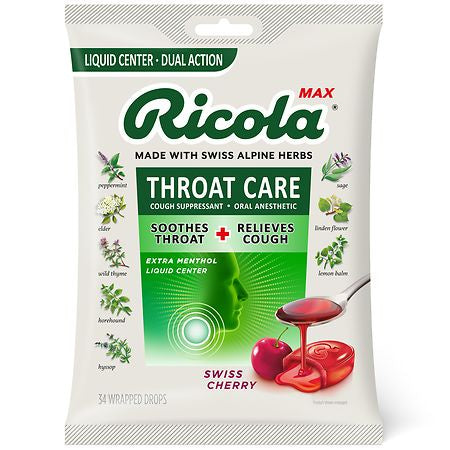 For nearly a century, Ricola drops have been soothing sore throats around the world. Ricola Max* Throat Care drops have a delicious flavor shell with an Extra Menthol liquid center which provides effective and soothing relief from sore throats and coughs. Ricola Max Throat Care Swiss Cherry drops combine the world-famous original Ricola blend of 10 Swiss Alpine herbs with sweet cherry and natural menthol to provide deliciously soothing throat and cough relief. From that tickle in the back of your throat to a bad cough, Ricola is there to support you with great tasting soothing relief. * Ricola Max* Throat Care is our strongest cough drop. Age Group: adult.