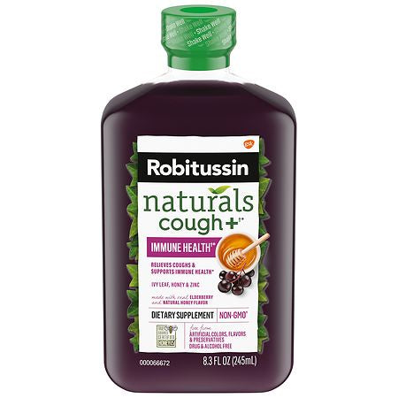 Daily Supplement for Cough Relief and Immune Health Robitussin Naturals Cough Relief + Immune Health is powered by the best of nature to help relieve your cough and support your immune system. Each dose of this drug free alcohol free dual action cough syrup is made with purposefully selected ingredients. Real ivy leaf and honey help relieve the occasional cough associated with hoarseness dry throat and irritants while zinc offers immune support (1 2). Free from artificial colors flavors and preservatives this Robitussin cough syrup is made with real elderberry and infused with True Source Certified Honey for added flavor. Robitussin Naturals Cough Relief + Immune Health is a vegetarian Non-GMO liquid that is easy to take (3). Simply take one tablespoon daily as needed to help relieve cough and clear mucus (1 2). This elderberry cough syrup for adults comes in an easily portable bottle that s made from up to 30% plant based materials. (1) Honey and ivy leaf relieve occasional cough associated with ho