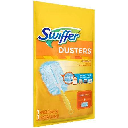 Swiffer Dusters Multi-Surface Refills, (1 Handle, 1 Duster):Swiffer Dusters TRAP + LOCK dust & allergens* *common inanimate allergens from cat and dog dander & dust mite matterSpecially coated fibers grab onto dust & don't let goUniquely designed to Trap + Lock dust from even the tight spaces in your home.Use with Swiffer Dusters short handle or Swiffer Dusters extendable handleGreat for dusting electronics,dusting furniture, knick-knacks in your home or office, blinds, ceiling fans, and even your car interior