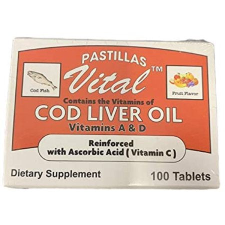 Pastillas Vital, Tablets Cod/Fish Liver Oil Extract, 100-Count:Dietary supplement for men, women and childrenContains vitamins A and D supplement and other beneficial ingredientsOdorless and tastelessVital fish oil pills are a good alternative to liquid cod liver oilIdeal for taking every day with a mealContains folic acid and vitamins B1 and B2Helps to boost the immune systemPromotes healthy skin and bones100-count packCompare to Mccoy